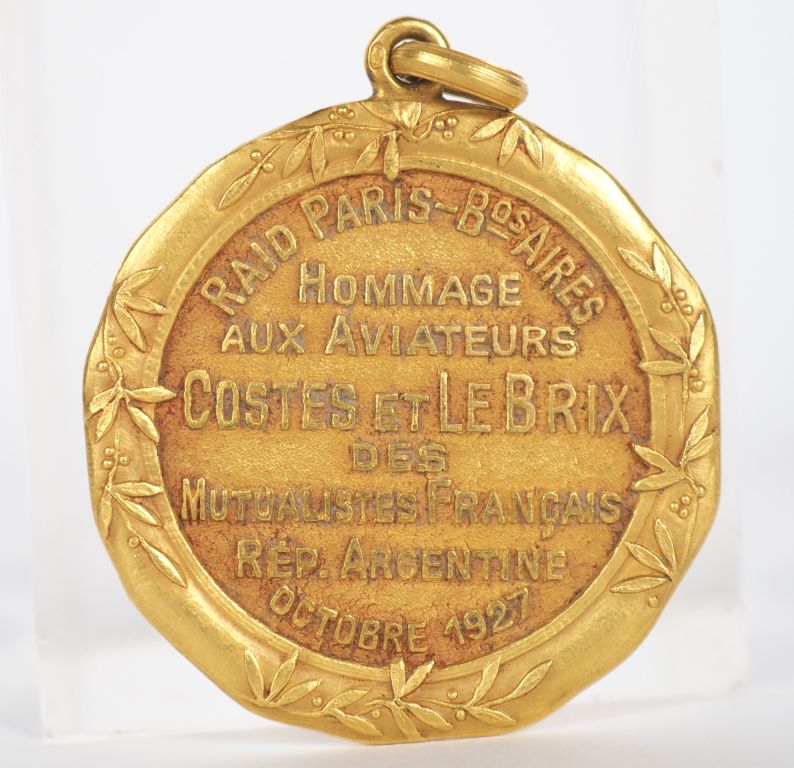 Médaille commémorative en or du Raid Paris Buenos-Aires portant la mention "Hommage aux aviateurs Costes et Le Brix des mutualistes français. République Argentine Octobre 1927". Poids : 17,82 g Diam. 3,5 cm