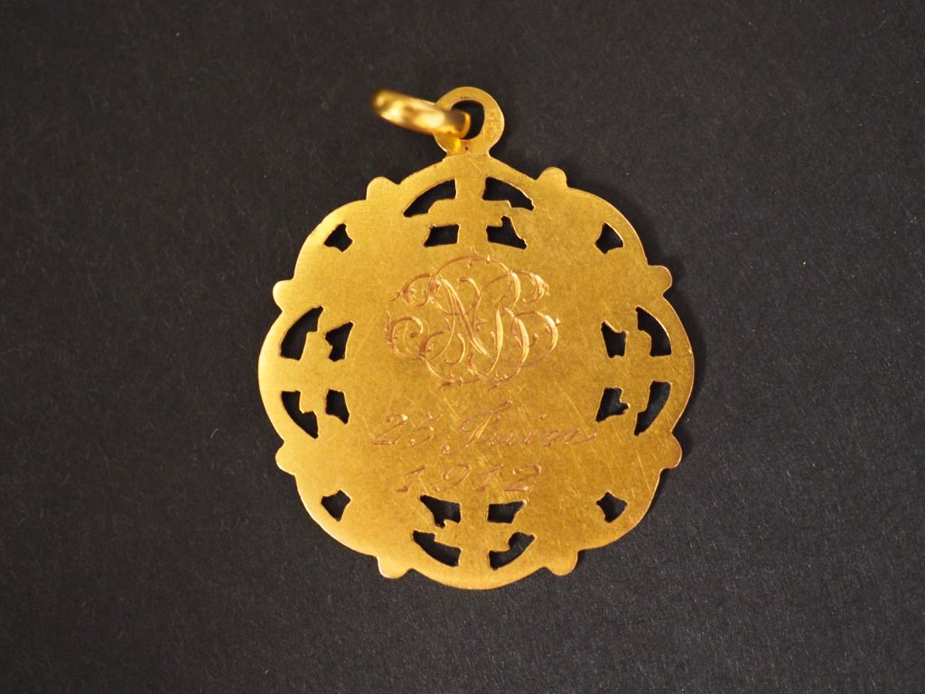 Médaille de baptême en or jaune, à décor de calice et de rinceaux. Poids. 2,55 g (gravée)