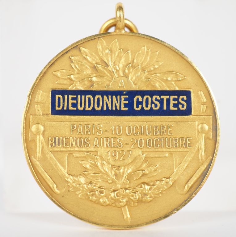 Médaille en or de la ville de Buenos-Aires offerte à Dieudonné Costes signée Constante Rossi. Sur une face : les armes de la ville de Buenos-Aires. Mention Municipalidad de Buenos-Aires Republica Argentina. Sur l'autre face : Dieudonné Costes dans un encadré émaillé bleu nuit. Paris, 10 octobre Buenos-Aires 20 octobre 1927 Poids : 17 g Diam. 3,2 cm