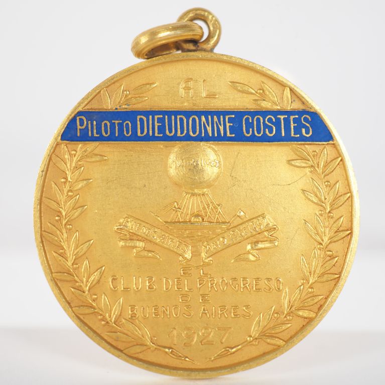 Médaille en or. Raid Paris Buenos-Aires 10 X 927 - 20 X 927 "Al piloto Dieudonné Costes, Club del Progress de Buenos-Aires 1927" Poids : 17,99 g Diam. 3,2 cm