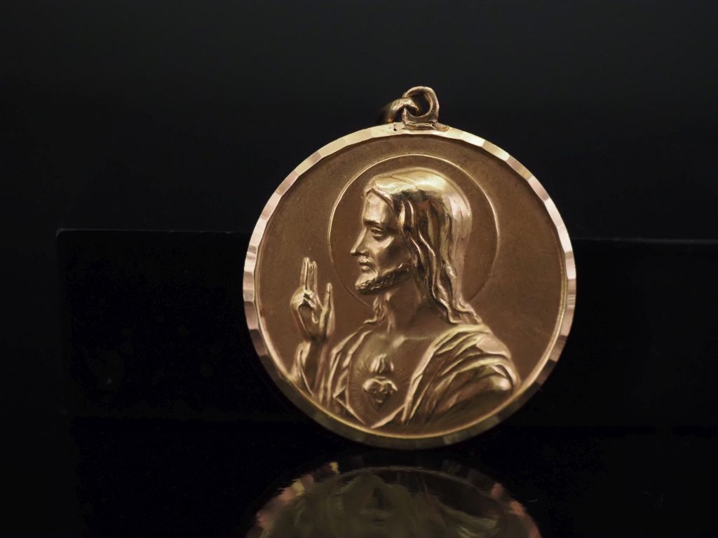 Médaille religieuse double faces en or jaune 750, figurant une Vierge à l'Enfant d'un côté et le Christ de l'autre. Diam. 3,3 cm Poids. 9,79 g