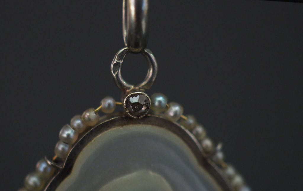 Médaille religieuse en or blanc, nacre et perles, figurant la Sainte Vierge en prière de profil. 2,6 x 1,9cm Poids tel. 2,34 g