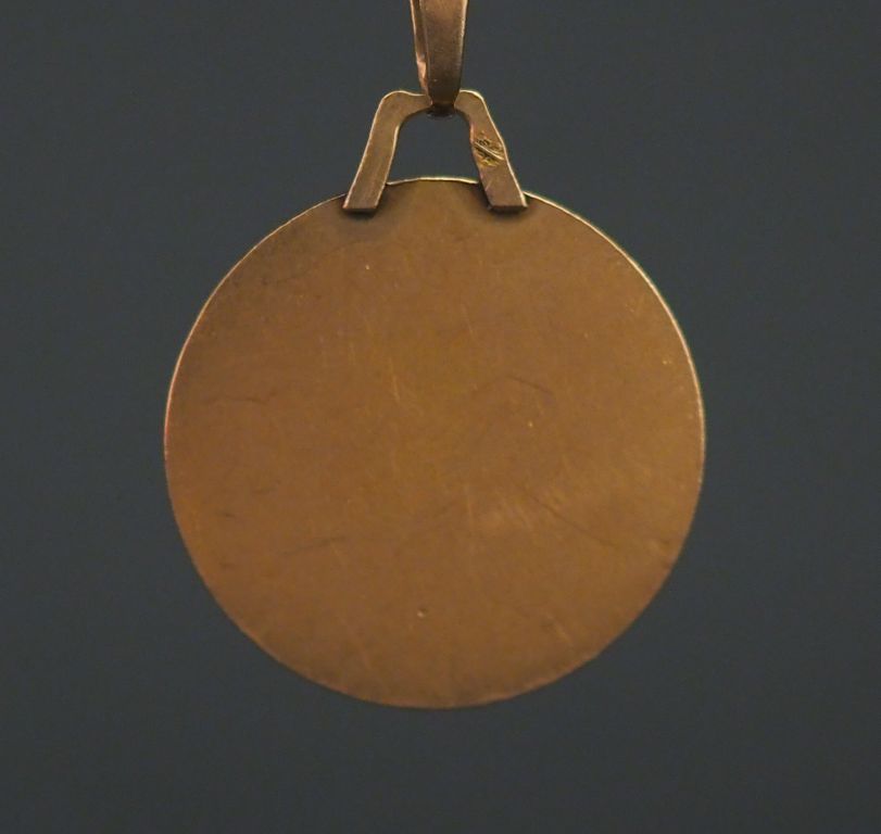 Médaille religieuse en or jaune, figurant la Sainte Vierge de profil sur fond quadrillé. Diam. 2,2 cm Poids. 3,86 g