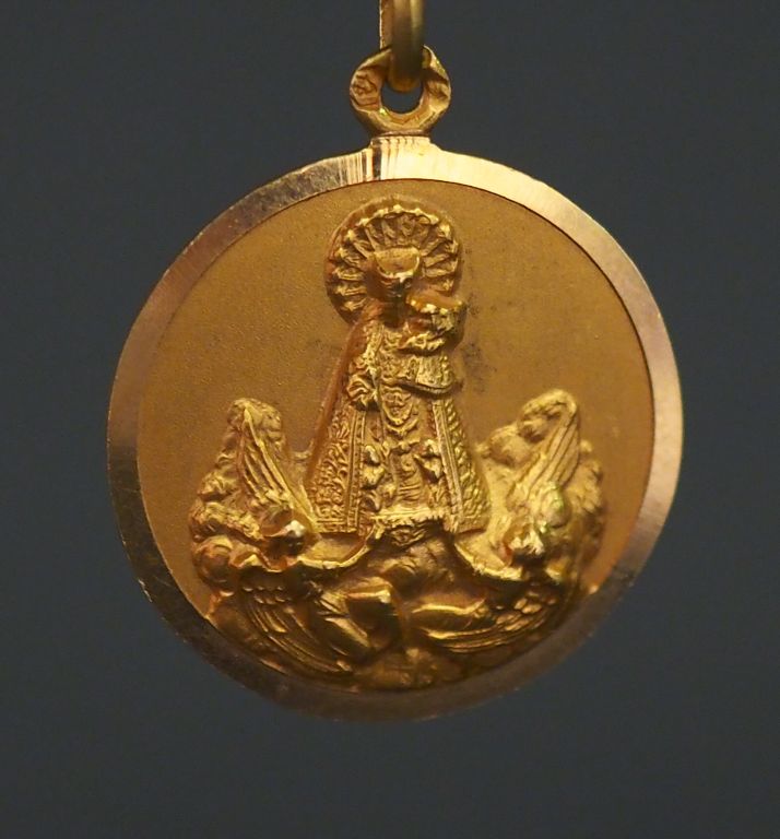 Médaille religieuse en or jaune, figurant la Sainte Vierge en Majesté en relief. Diam. 2,2 cm Poids. 4,20 g