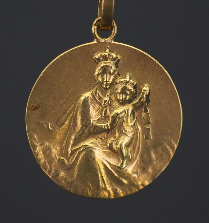 Médaille religieuse en or jaune, figurant le Sacré-Cœur de Jésus sur une face et la Vierge à l'Enfant sur l'autre face. Diam. 2 cm Poids. 4,08 g