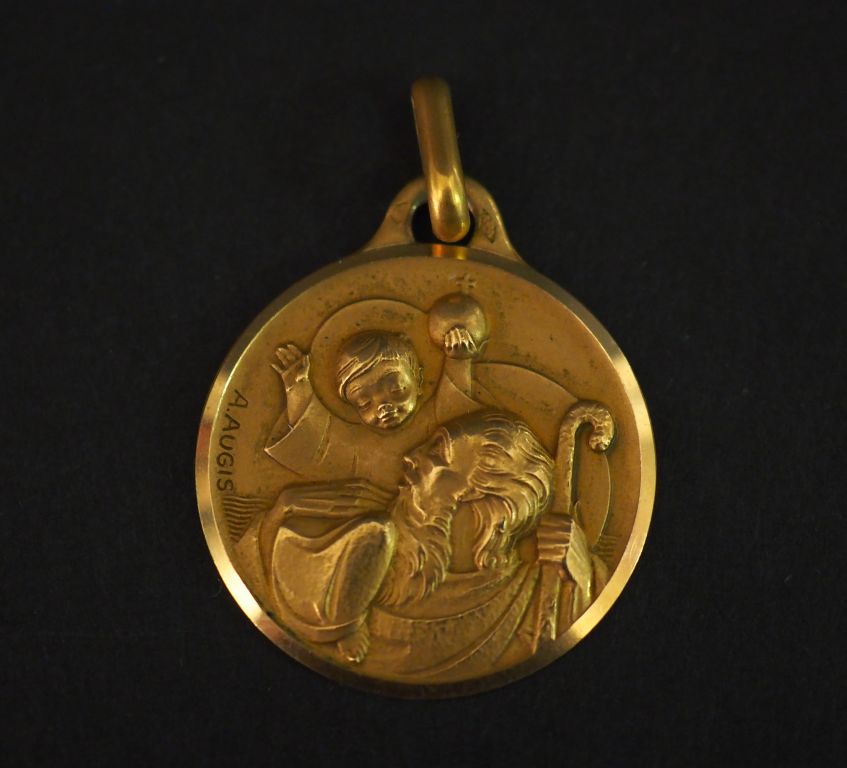 Médaille religieuse en or jaune, figurant Saint Jean-Baptiste portant le Christ sur ses épaules. Signée A. Augis. Diam. 2,3 cm Poids. 6,16 g