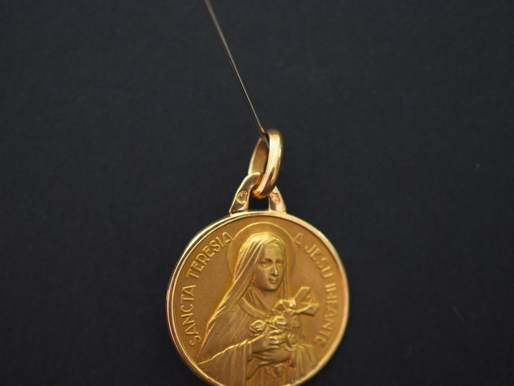 Médaille religieuse en or jaune, figurant Sainte Thérèse de l'Enfant Jésus. Gravée au revers "Je ferai tomber du ciel une pluie de roses". Diam. 1,8 cm Poids. 4,41 g