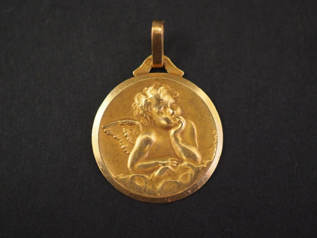 Médaille religieuse en or jaune, figurant un angelot. Diam. 1,9 cm Poids. 2,82 g (gravée)