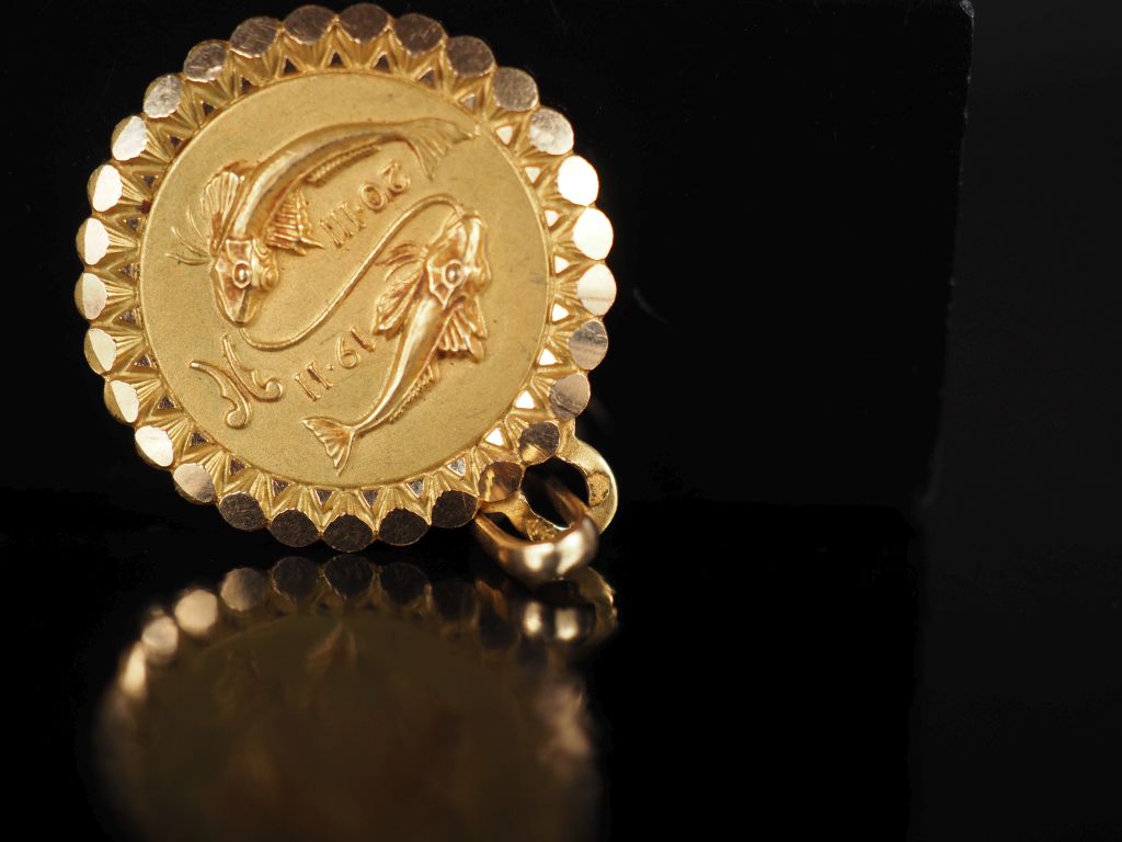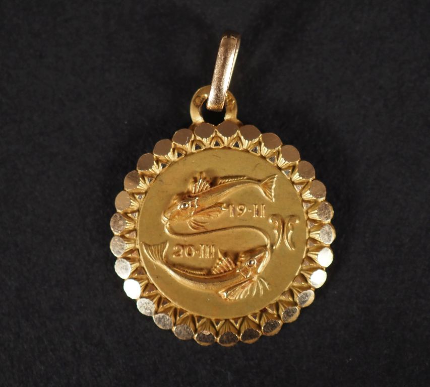 Médaillon en or jaune 750, à décor de poissons et agrémenté de dates. Joli pourtour, à décor de pastilles. Diam. 2 cm Poids. 2,71 g