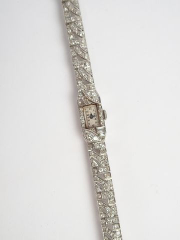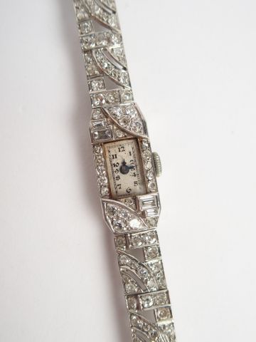 Montre bracelet de dame Art déco en platine, pavée de diamants taille ancienne. 17cm, 29,5gr tel