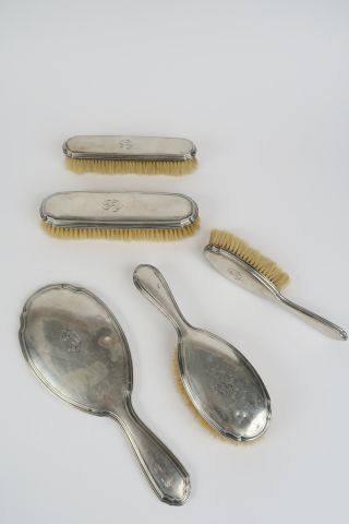 Nécessaire de toilette en argent, poinçon Minerve, 4 brosses et 1 miroir , monogrammés.