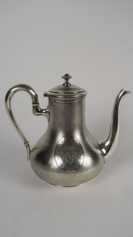 ODIOT. Théière en argent, à décor guilloché et monogrammé dans un cartouche feuillagé. Poids : 490 g
