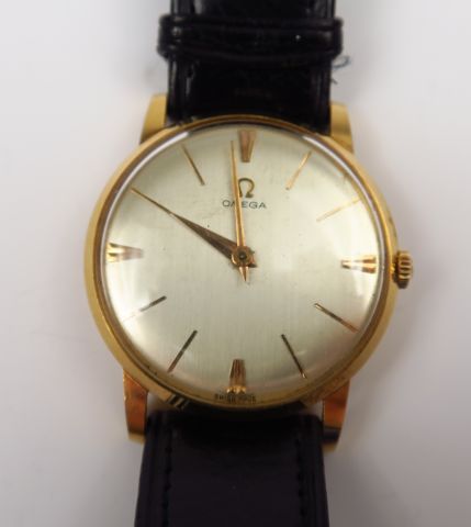 OMEGA. Montre d'homme, cadran en or, bracelet d'origine en cuir noir. Poids tel : 34,3 g