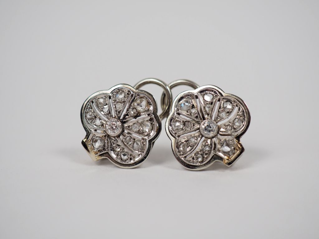 Paire de boucles d'oreilles à clips en or blanc serties de roses, en forme de fleurs. Poids tel. 5,99 g