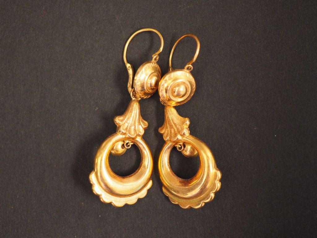 Paire de boucles d'oreilles en or jaune, à décor de palmette et de boule en pendeloque. H. 4 cm Poids. 3,79 g
