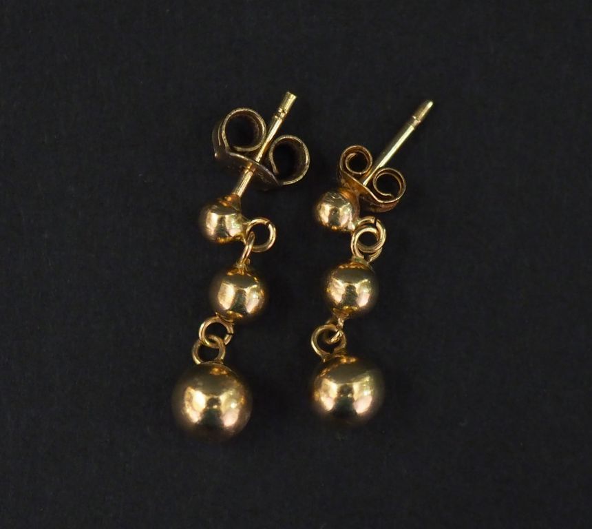 Paire de boucles d'oreilles en or jaune, composées de trois boules en chute dont deux en pendeloque. H. 1,7 cm Poids. 0,84 g (fermoirs dépareillés)