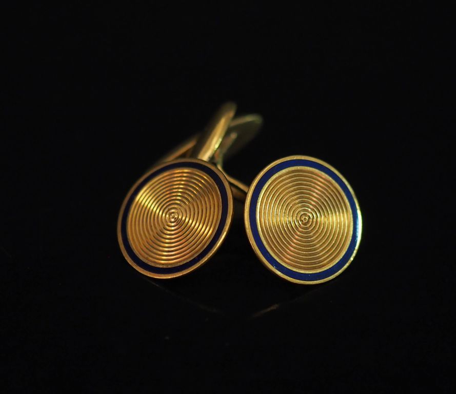 Paire de boutons de manchettes en or jaune et émail bleu nuit, à décor de cercles concentriques. Poids tel. 6,17 g