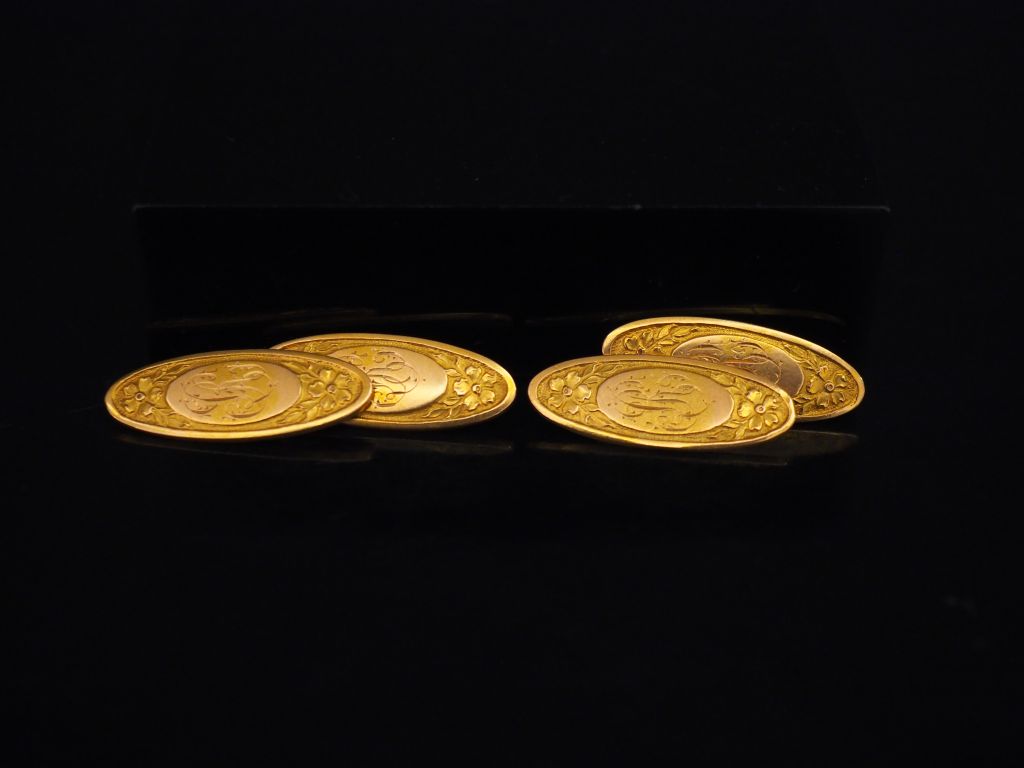 Paire de boutons de manchettes ovales de style Louis XVI en or jaune, à décor de cartouche monogrammé et de fleurs. H. 2,5 cm Poids. 10,32 g (traces de soudures)