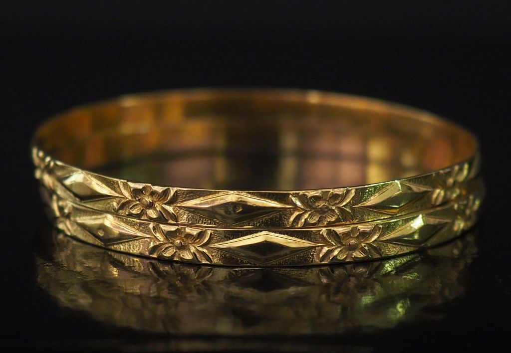 Lot de Paire de bracelets joncs, à décor de fleurs et losanges alternés. Diam au prix de 790 à 800 € en vente aux enchères par l'hôtel des ventes Primardeco