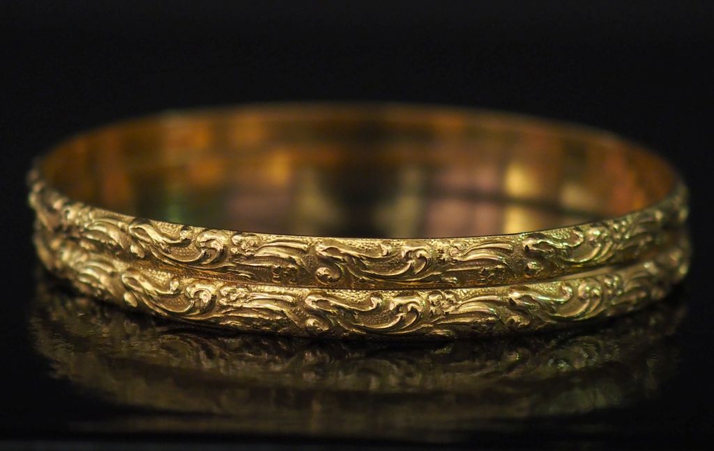 Paire de bracelets joncs en or jaune, à décor de rinceaux feuillagés et fleuris. Diam. 6,3g Poids. 32,85 g