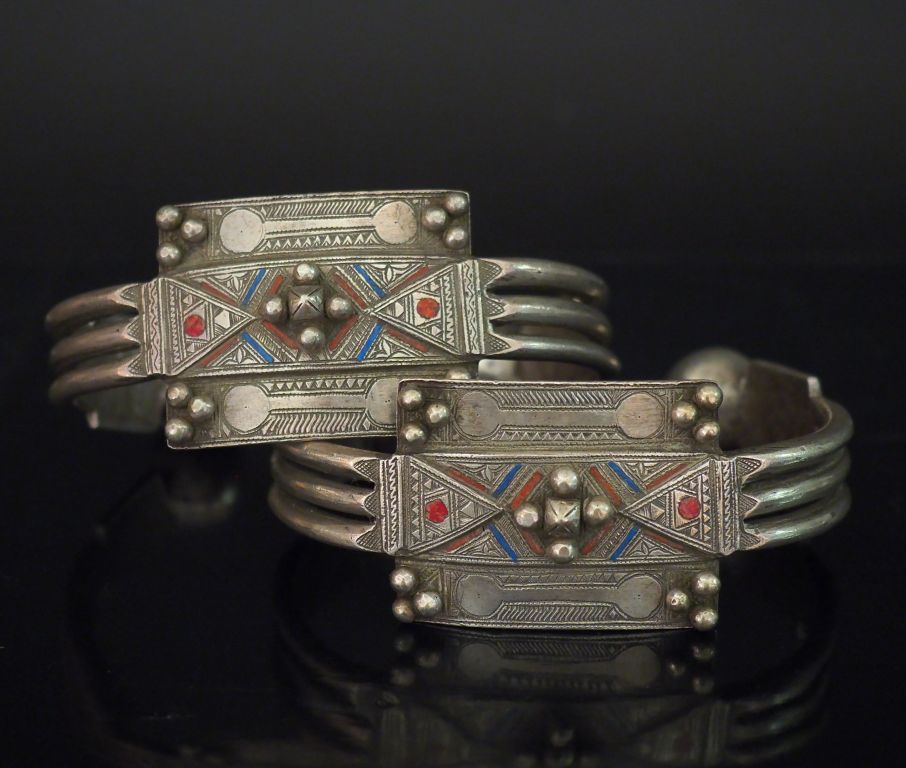 Paire de chevillères Afrique du Nord en argent, à décor de boules et motifs géométriques rehaussés d'émail bleu et rouge. Poids tel. 470 g (sauts d'émail)