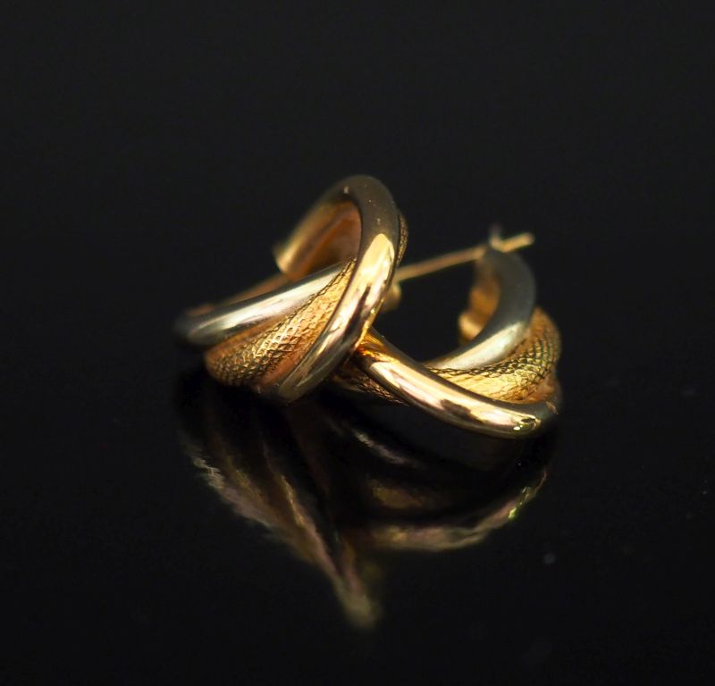 Paire de demi créoles de forme ovale deux tons d'or 750, à décor d'entrelacs. H. 2,3 cm Poids. 4,15 g
