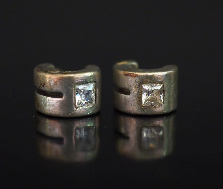 Paire de demi créoles en argent 925, serties d'une pierre à l'imitation du diamant. Poids tel. 4,71 g (manque les fermoirs)