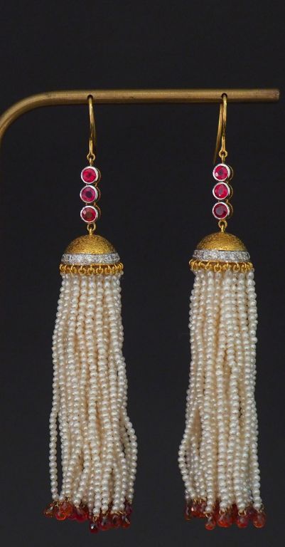 Paire de pendants d'oreilles en forme de pompons en or jaune, diamants, perles blanches et pierres de couleur. H. 11 cm Poids tel. 43,10 g