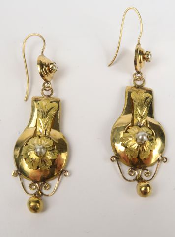 Paire de pendants d'oreilles Napoléon III en or 14 carats et perles. Poids tel : 3,3 g