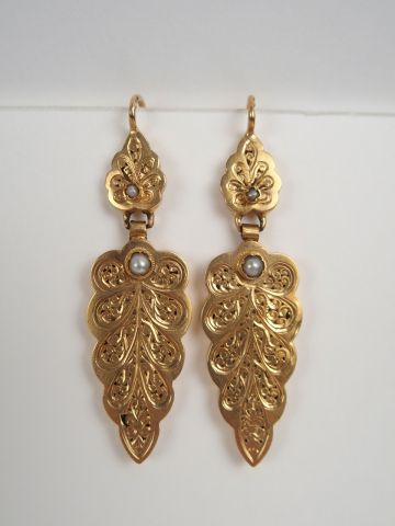 Lot de Paire de perce oreilles en or jaune, Napoléon III, rehausséesde perles au prix de 40 à 60 € en vente aux enchères par l'hôtel des ventes Primardeco