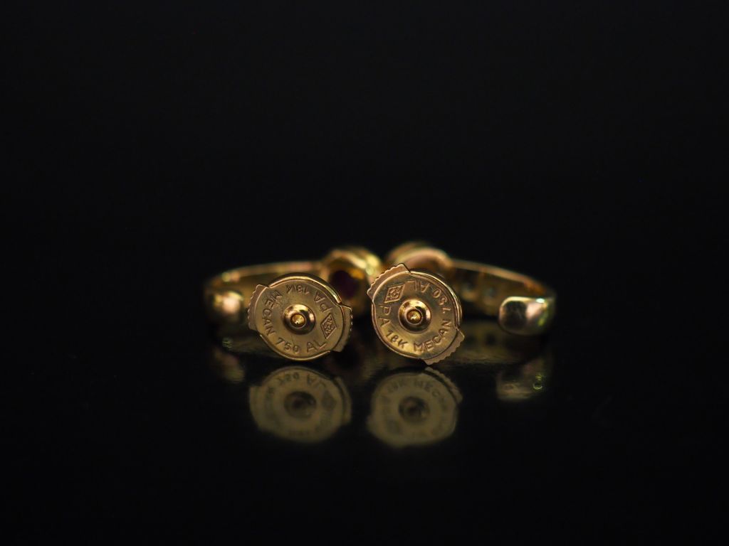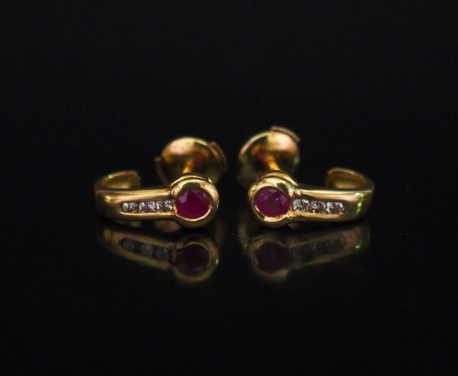 Paire de perce-oreilles en or jaune, sertis d'une pierre rose et d'une ligne de trois petits diamants. Fermoir en or jaune, système Alpa. H. 1,2 cm Poids tel. 2,55 g