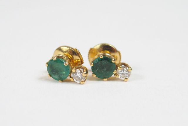 Paire de perce-oreilles monture or jaune, ornées d'une émeraude taille brillant soutenue par un diamant taille moderne. Poids tel: 2,4gr