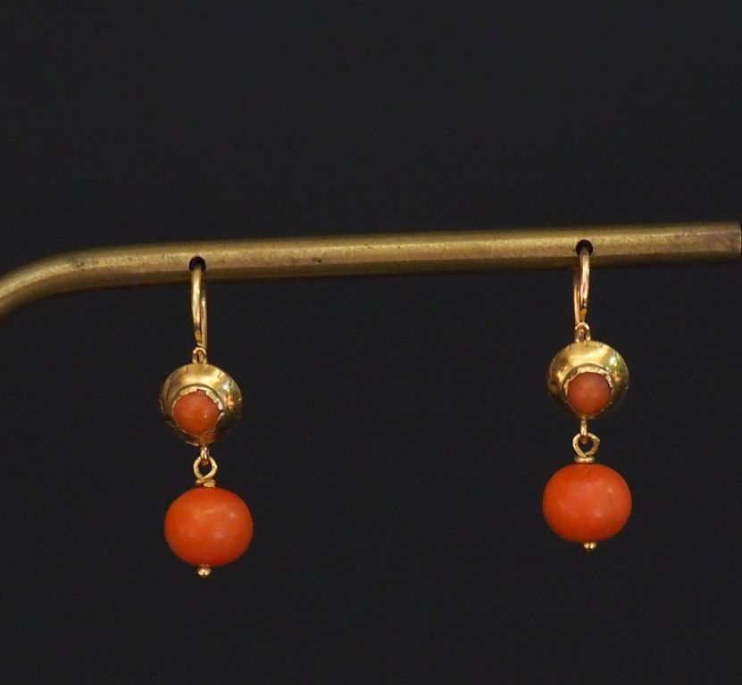 Paire de perce-oreilles Napoléon III en or jaune, sertis de corail en cabochon et d'une perle de corail en pendeloque. H. 3 cm Poids tel. 2,68 g
