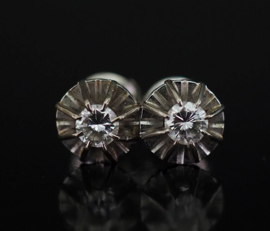Paire de perces oreilles en or blanc 750, sertis en leur centre d'un diamant de 0,2 ct environ. Fermoir en or blanc 750, système Alpa. Poids tel. 2,86 g