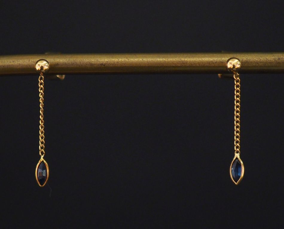 Paire de perces oreilles en or jaune 750, ornés d'une pendeloque se terminant par une pierre bleue de forme navette. H. 2,2 cm Poids tel. 0,91 g