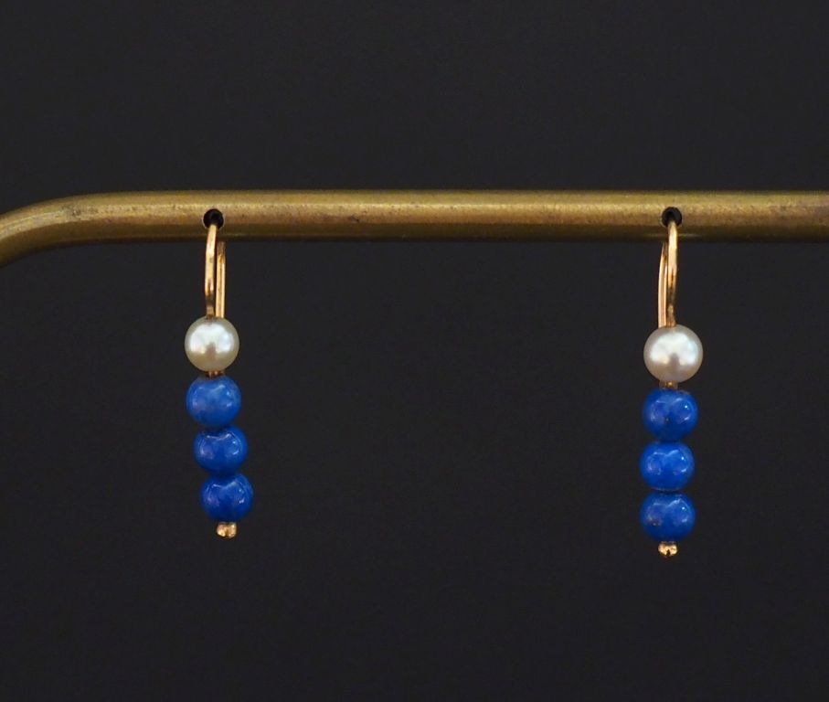 Paire de perces oreilles en or jaune 750, sertis de trois perles à l’imitation du lapis lazuli surmontés d’une perle blanche. H. 2,6 cm Poids tel. 1,47 g