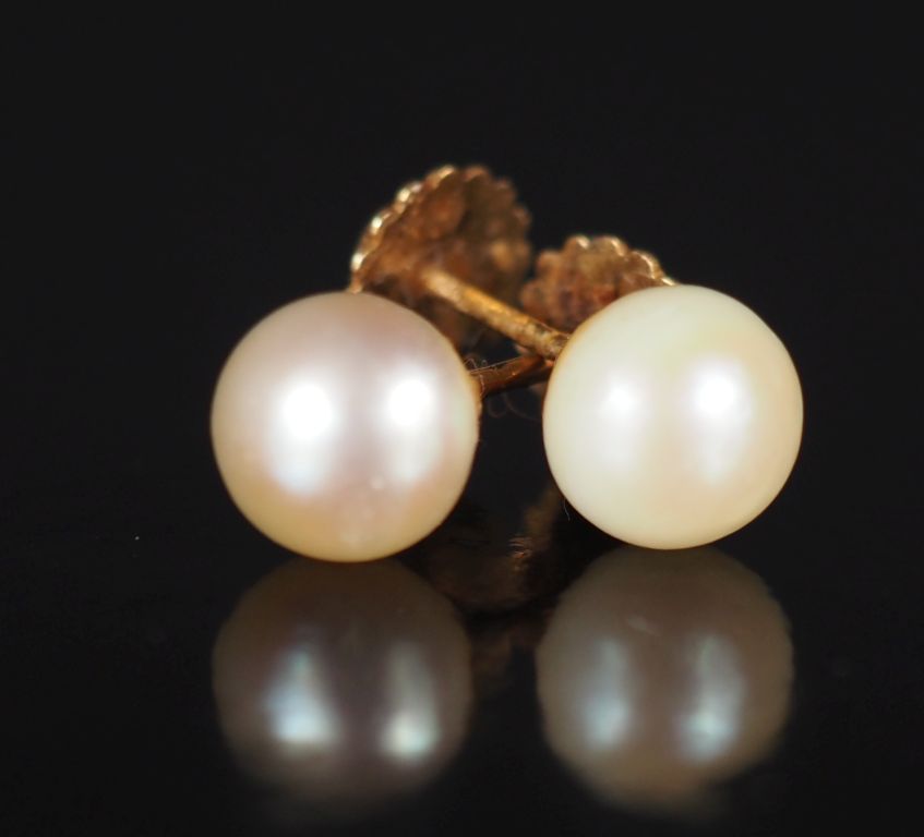 Paire de perces oreilles en or jaune 750, sertis d'une perle blanche. Diam. de la perle : 6 mm environ Poids tel. 1,58 g (une perle usée)
