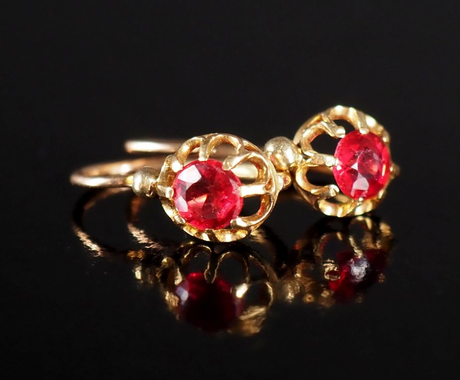 Paire de perces oreilles en or jaune 750, sertis d'une pierre rouge. H. 1,8 cm Poids tel. 2,50 g