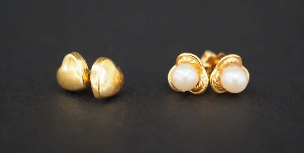 Paire de perces oreilles en or jaune en forme de cœur. Poids. 0,43 g (manque les fermoirs) On y joint une paire de perces oreilles en or jaune et perle. Poids tel. 0,80 g
