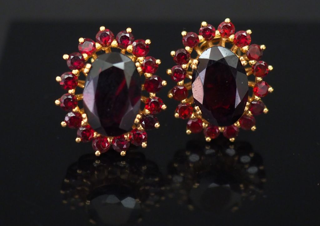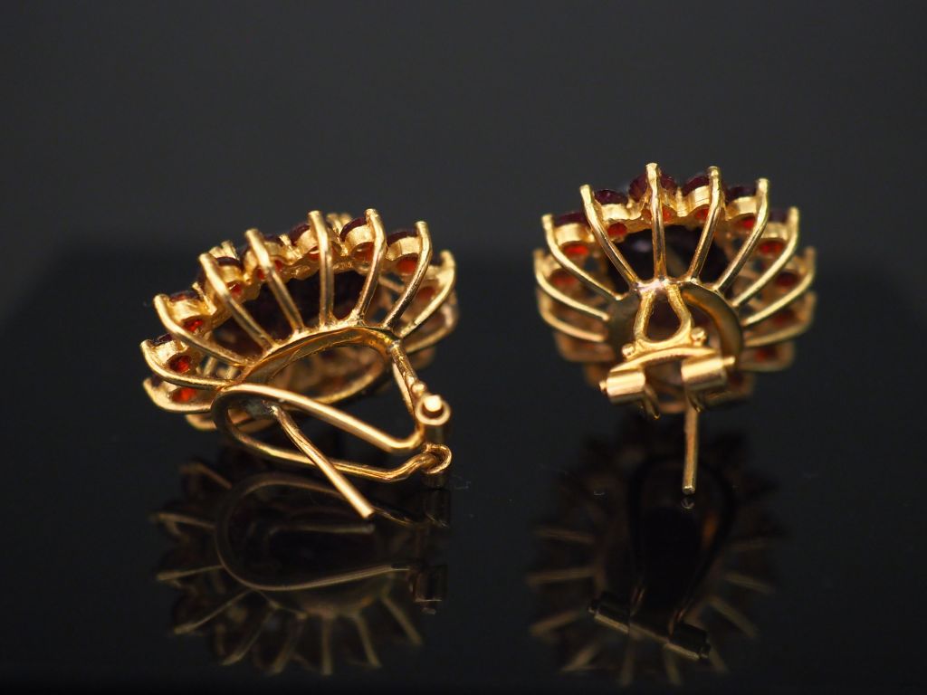 Paire de perces oreilles en or jaune en forme de fleurs, serties de grenats. H. 2 cm Poids tel. 10,04 g