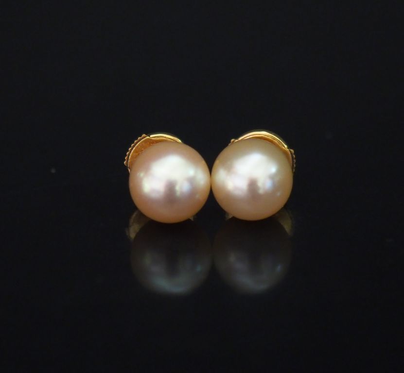 Paire de perces oreilles en or jaune, serties d’une perle blanche. Système Alpa. Poids tel. 2,94 g