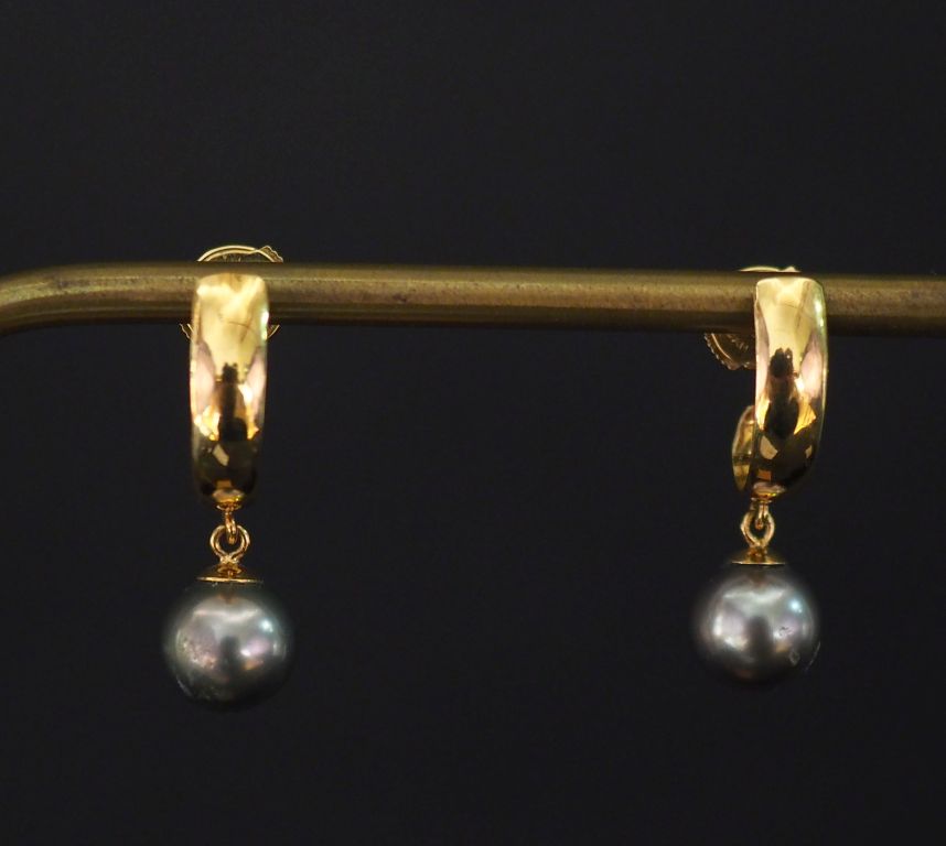 Paire de perces oreilles Napoléon III en or jaune 750, à décor d'une perle grise en pendeloque. Fermoir en or jaune 750, système Alpa. H. 2,7 cm Diam. de la perle : 8 mm environ Poids tel. 5,68 g
