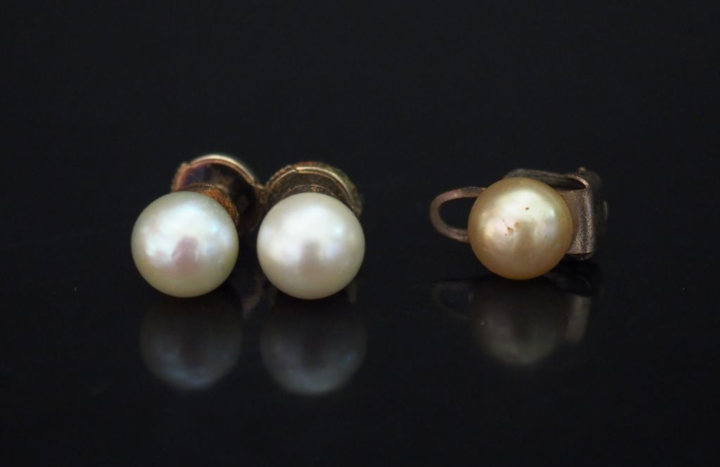 Paire de puces d’oreilles en or blanc, serties d’une perles blanches. Système Alpa. Poids tel. 2,98 g (recollées) On y joint un clip d’oreille en métal et perle.