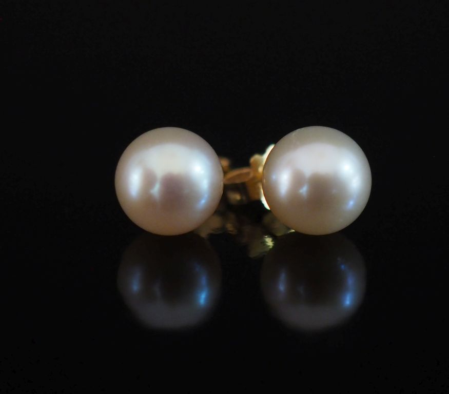 Paire de puces d'oreilles en or jaune 750, serties d'une perle blanche. Diam. de la perle : 6,6 mm environ Poids tel. 1,05 g