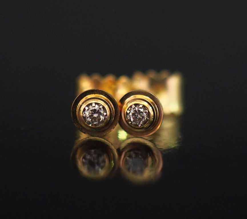Paire de puces d'oreilles en or jaune 750, serties en leur centre d'un petit diamant. Poids tel. 0,96 g