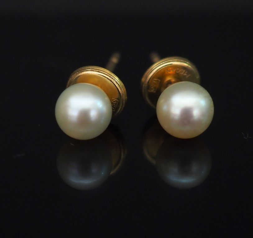 Paire de puces d’oreilles en or jaune et perles. Poids tel. 1,84 g