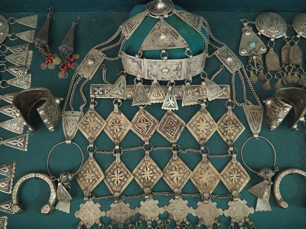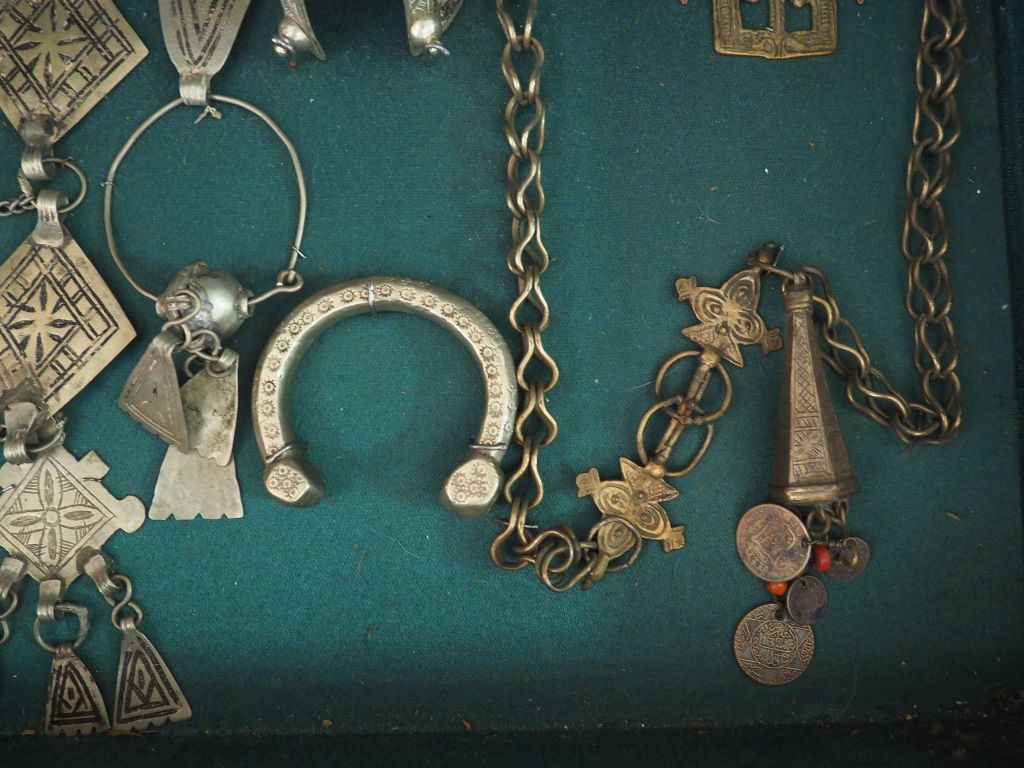 Parure Afrique du Nord en métal. Comprenant notamment un ornement pour la tête, des chevillères, bracelets, boucles d'oreilles, fibules etc … Dans un présentoir.
