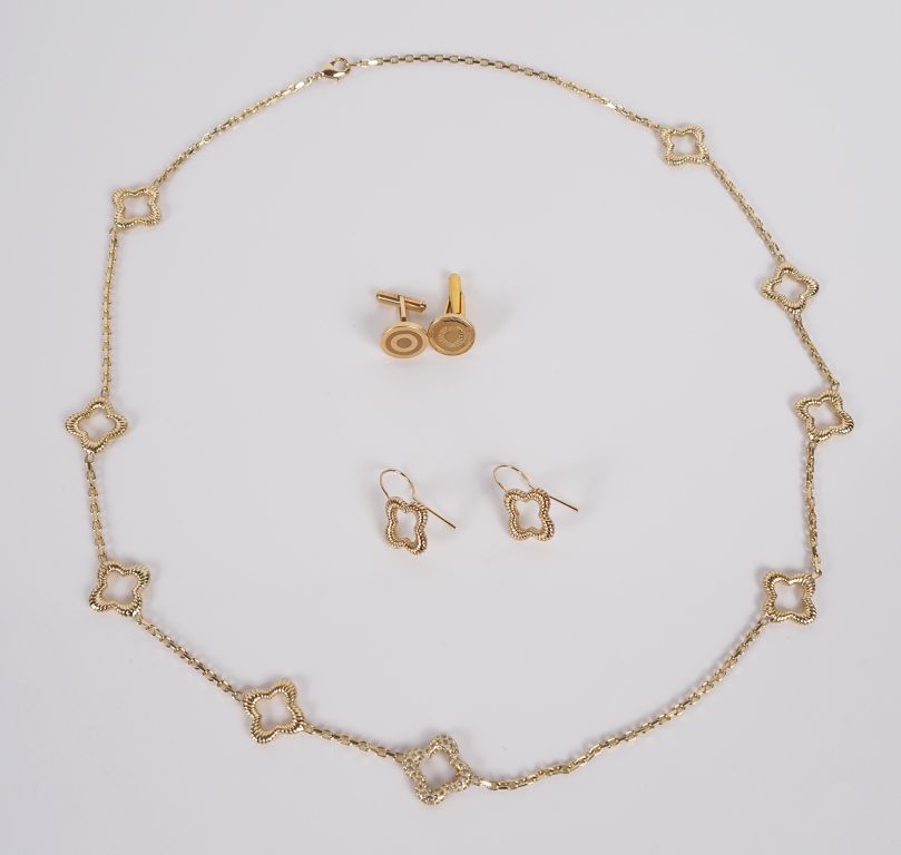 Parure en métal doré, à décor de croix à bords arrondis. Comprenant : - une paire de boucles d’oreilles - un sautoir On joint : MURAT Paire de boutons de manchettes en plaqué or.