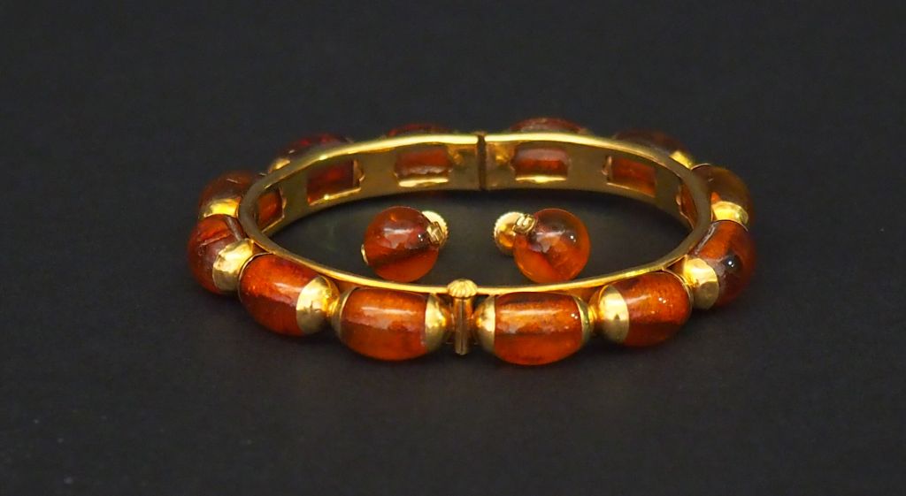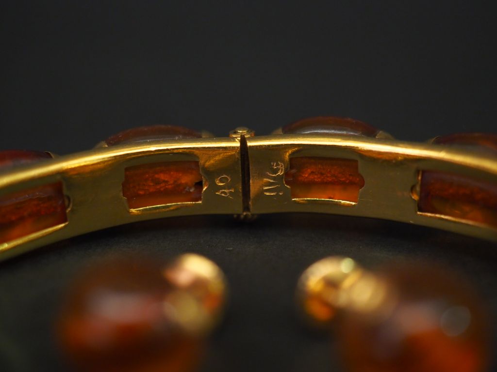Parure en or jaune et ambre. Comprenant : - une paire de perces oreilles en or jaune et boules d’ambre. - un bracelet jonc en or jaune, à décor d’ambre en cabochon. Poids tel. 26,57 g
