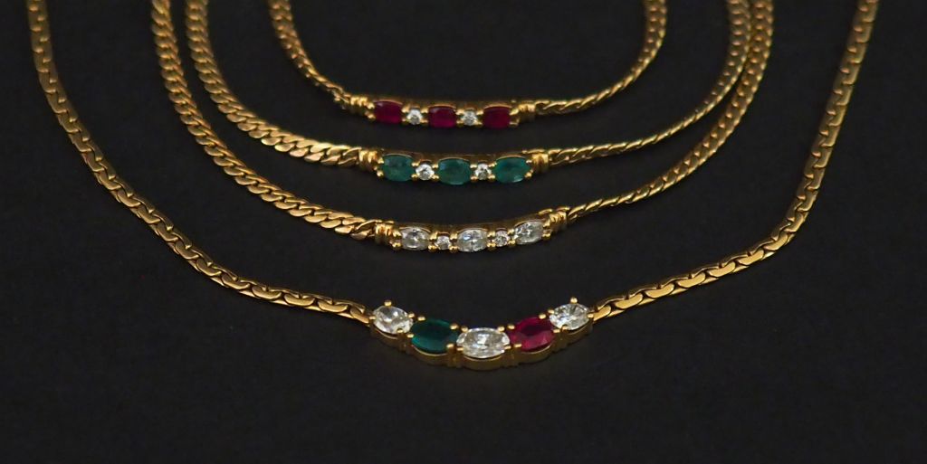 Parure en or jaune et pierres de couleur comprenant : - un collier en or jaune une émeraude et un rubis synthétique - un bracelet or jaune et 5 diamants - un bracelet en or jaune 3 rubis synthétiques et deux diamants - un bracelet en or jaune, 3 émeraudes et deux diamants Poids tel : 31,72 g